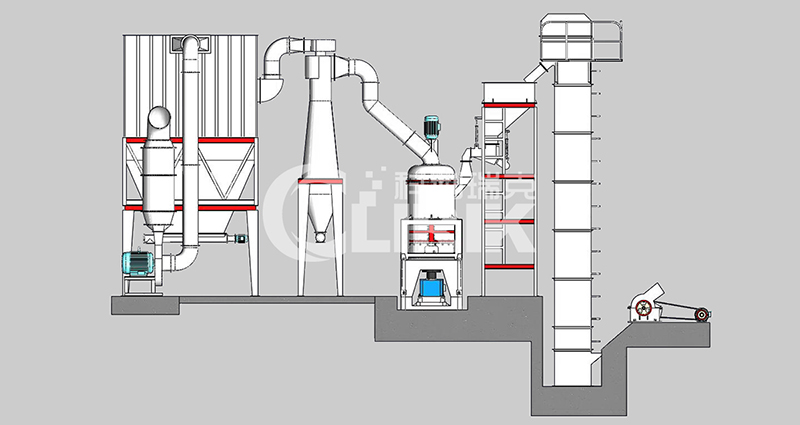我們把方解石大塊物料經破碎機破碎到能進入磨粉機的入料細度(15mm-50mm),經過破碎后的方解石小塊物料經提升機送至料倉,再經振動給料機將其均勻定量的送入磨機研磨室內進行研磨。